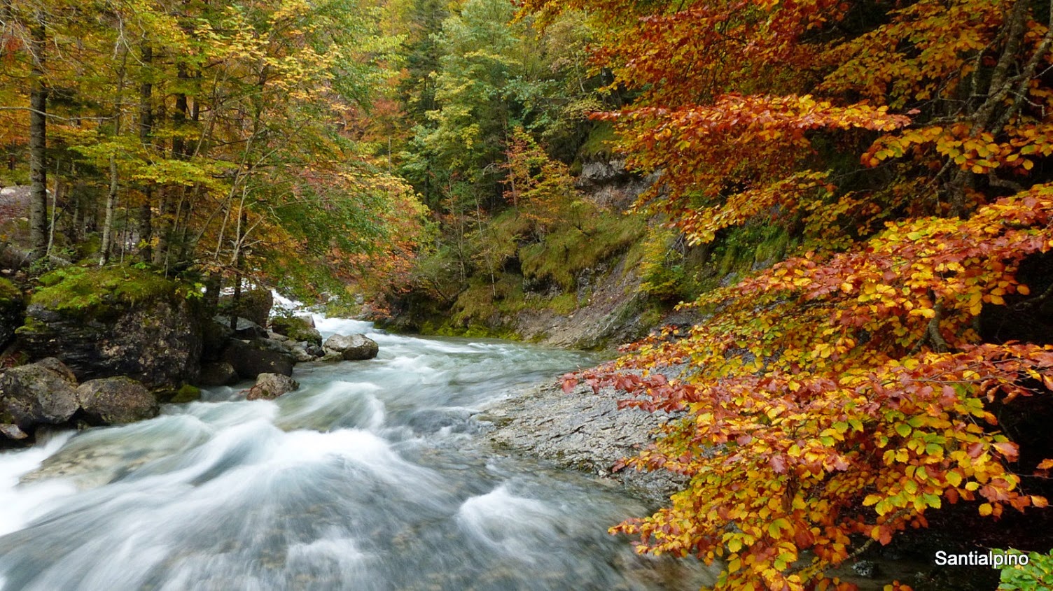 Verde en los abetos y pinos, rojo en los arces y serbales, amarillo en los abedules, tostados de distintas tonalidades en los hayedos.... y según la altitud a la que nos encontremos, el cambio de color es mayor o menor. Toda una paleta de colores pastel bajo unas inmensas murallas de caliza.